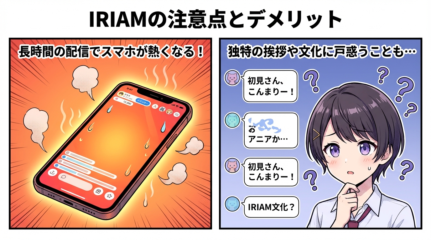 IRIAMはモーションライブ方式を採用しており、表情データのみを送信するため、カメラ映像が漏れるリスクはありません。ただし、SNS連携による情報の紐づけや、配信中に本名を口にしてしまうなど配信者自身の不注意による身バレには気をつけましょう。