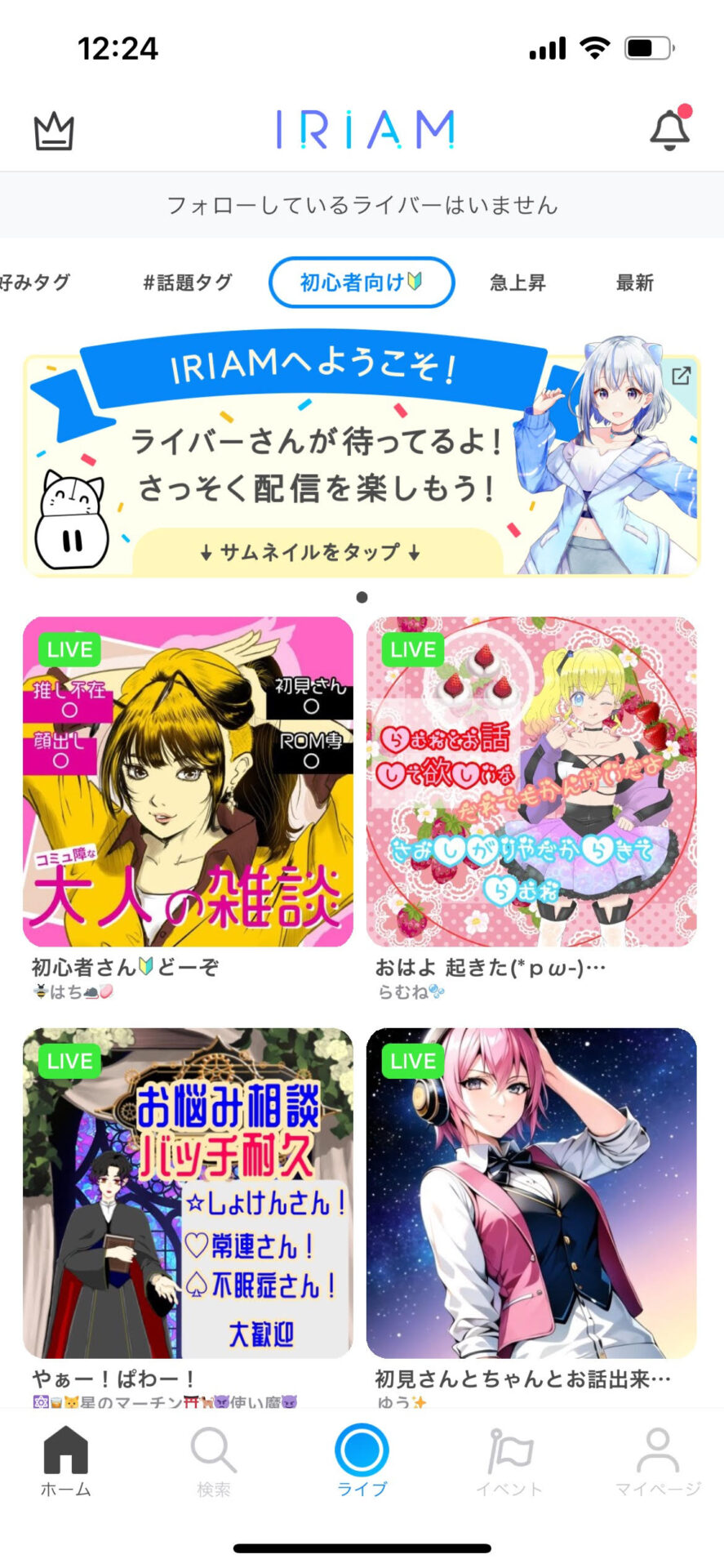 ホーム画面に表示される「初心者向け配信」タブから、気になる配信をのぞいてみましょう。